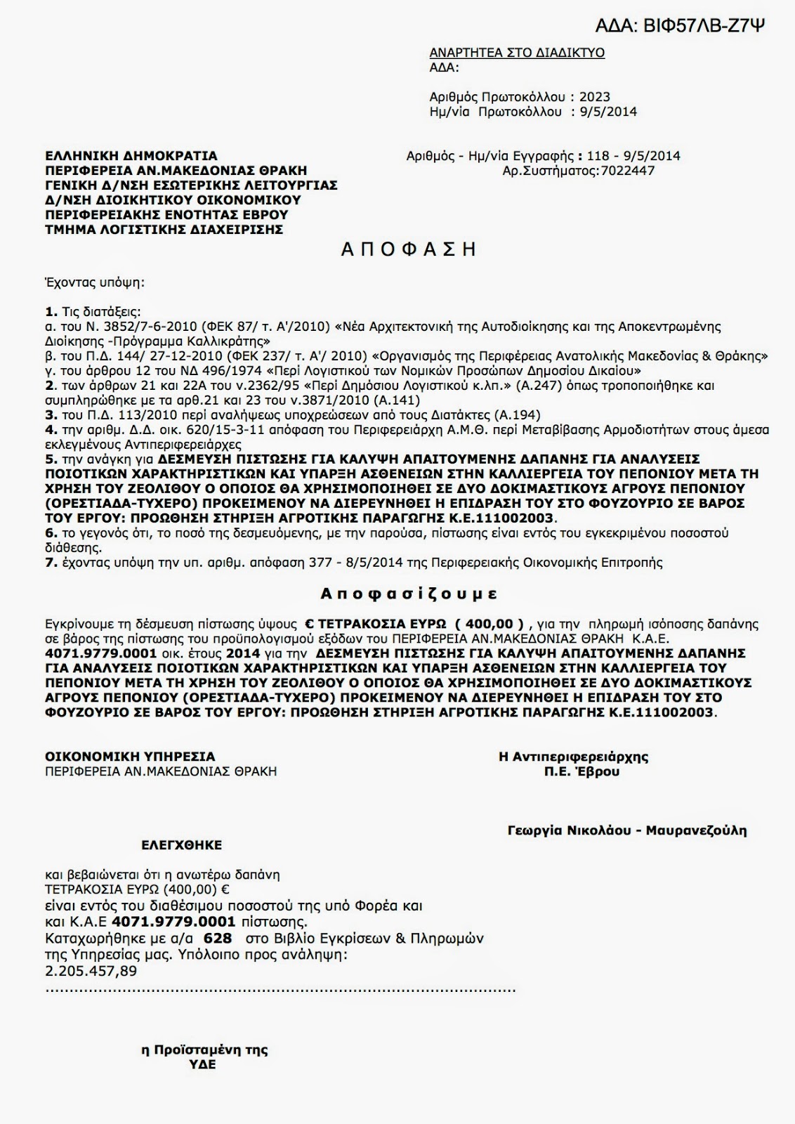 ΔΕΣΜΕΥΣΗ ΠΙΣΤΩΣΗΣ ΓΙΑ ΚΑΛΥΨΗ ΑΠΑΙΤΟΥΜΕΝΗΣ ΔΑΠΑΝΗΣ ΓΙΑ ΑΝΑΛΥΣΕΙΣ ΠΟΙΟΤΙΚΩΝ ΧΑΡΑΚΤΗΡΙΣΤΙΚΩΝ ΚΑΙ ΥΠΑΡΞΗ ΑΣΘΕΝΕΙΩΝ ΣΤΗΝ ΚΑΛΛΙΕΡΓΕΙΑ ΤΟΥ ΠΕΠΟΝΙΟΥ ΜΕΤΑ ΤΗ ΧΡΗΣΗ ΤΟΥ ΖΕΟΛΙΘΟΥ Ο ΟΠΟΙΟΣ ΘΑ ΧΡΗΣΙΜΟΠΟΙΗΘΕΙ ΣΕ ΔΥΟ ΔΟΚΙΜΑΣΤΙΚΟΥΣ ΑΓΡΟΥΣ ΠΕΠΟΝΙΟΥ (ΟΡΕΣΤΙΑΔΑ-ΤΥΧΕΡΟ)