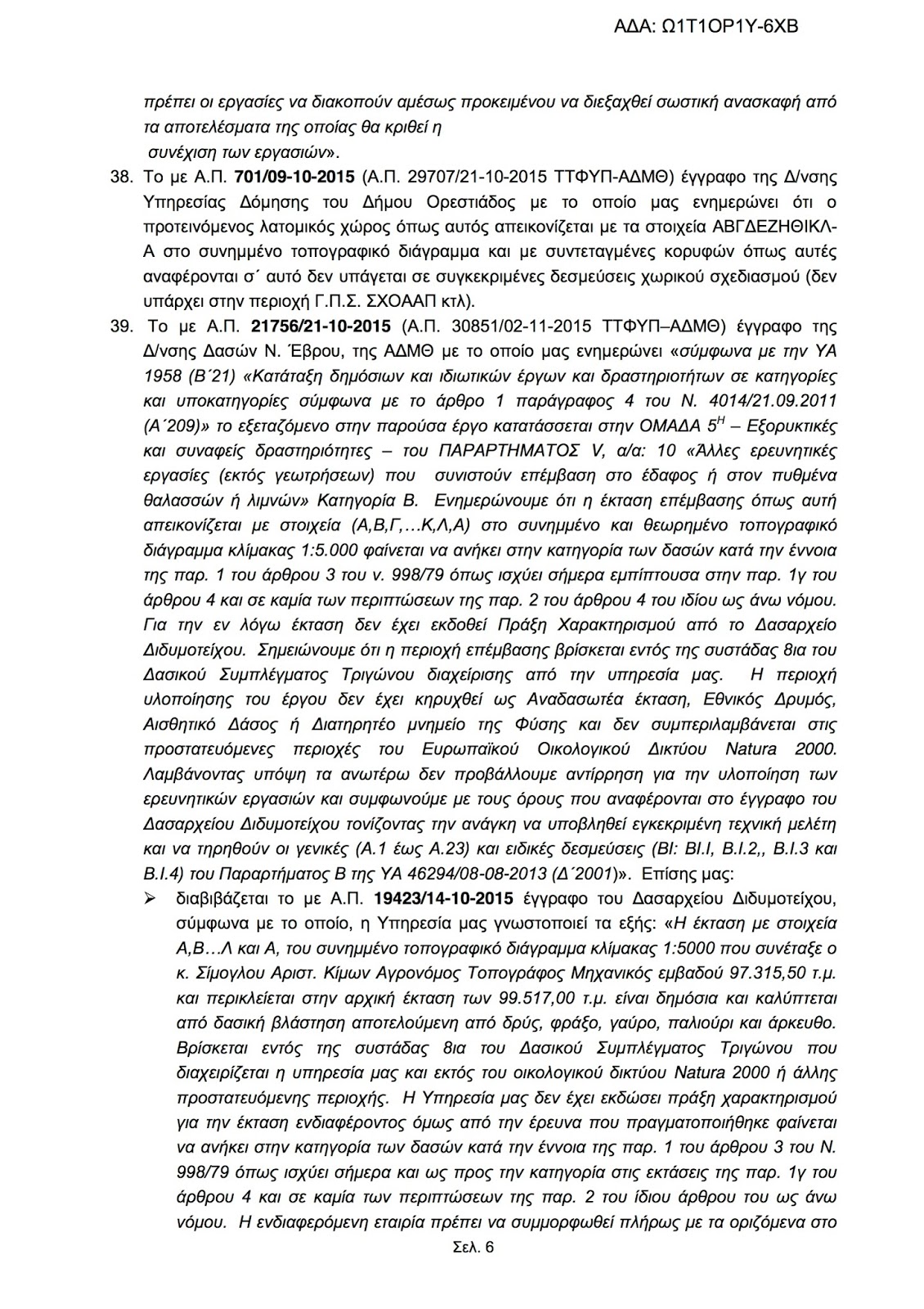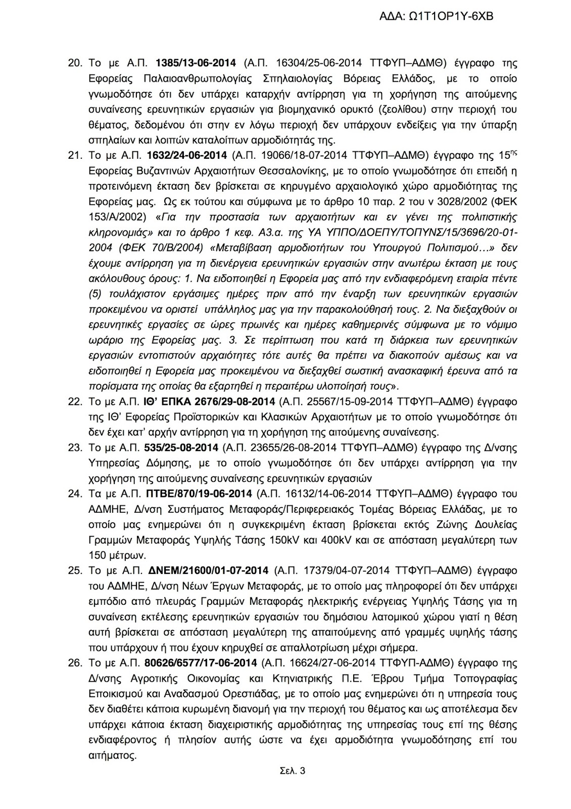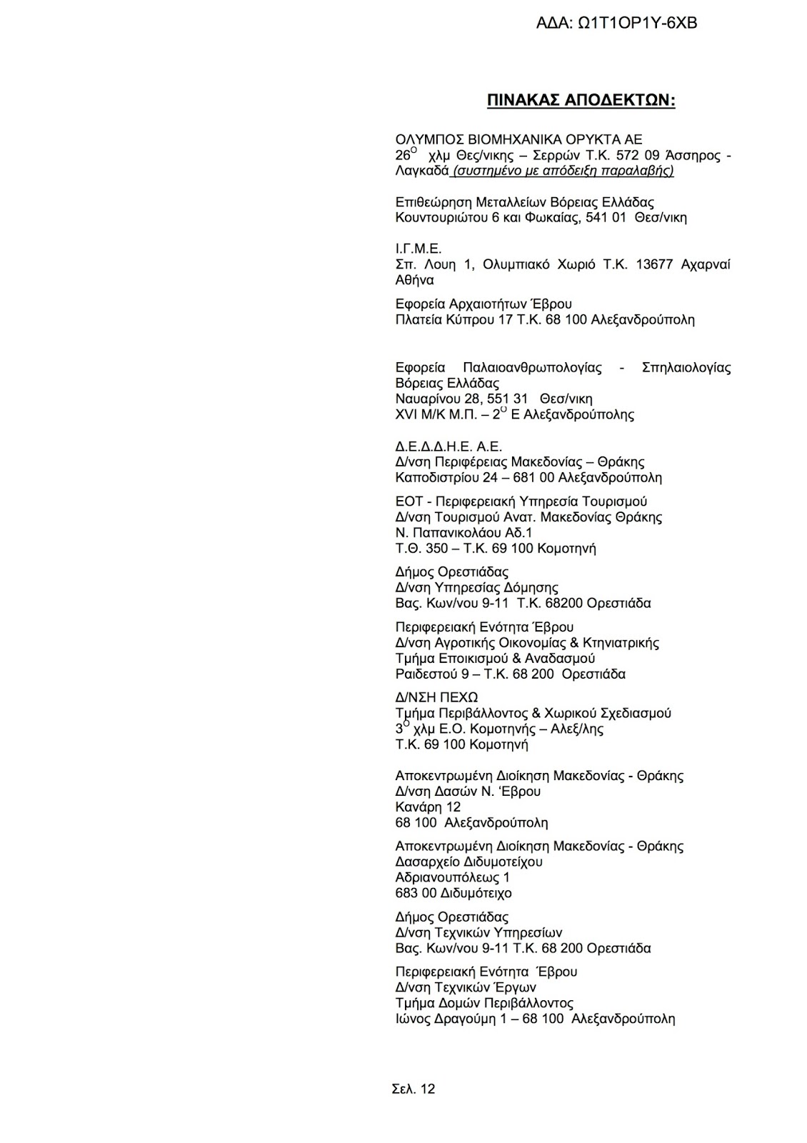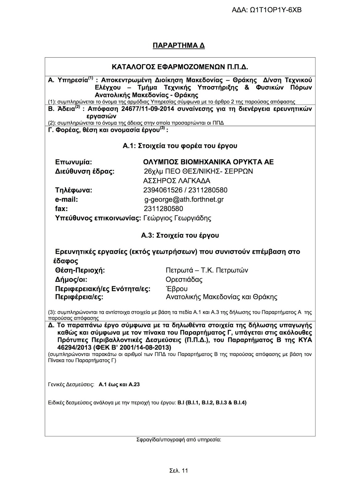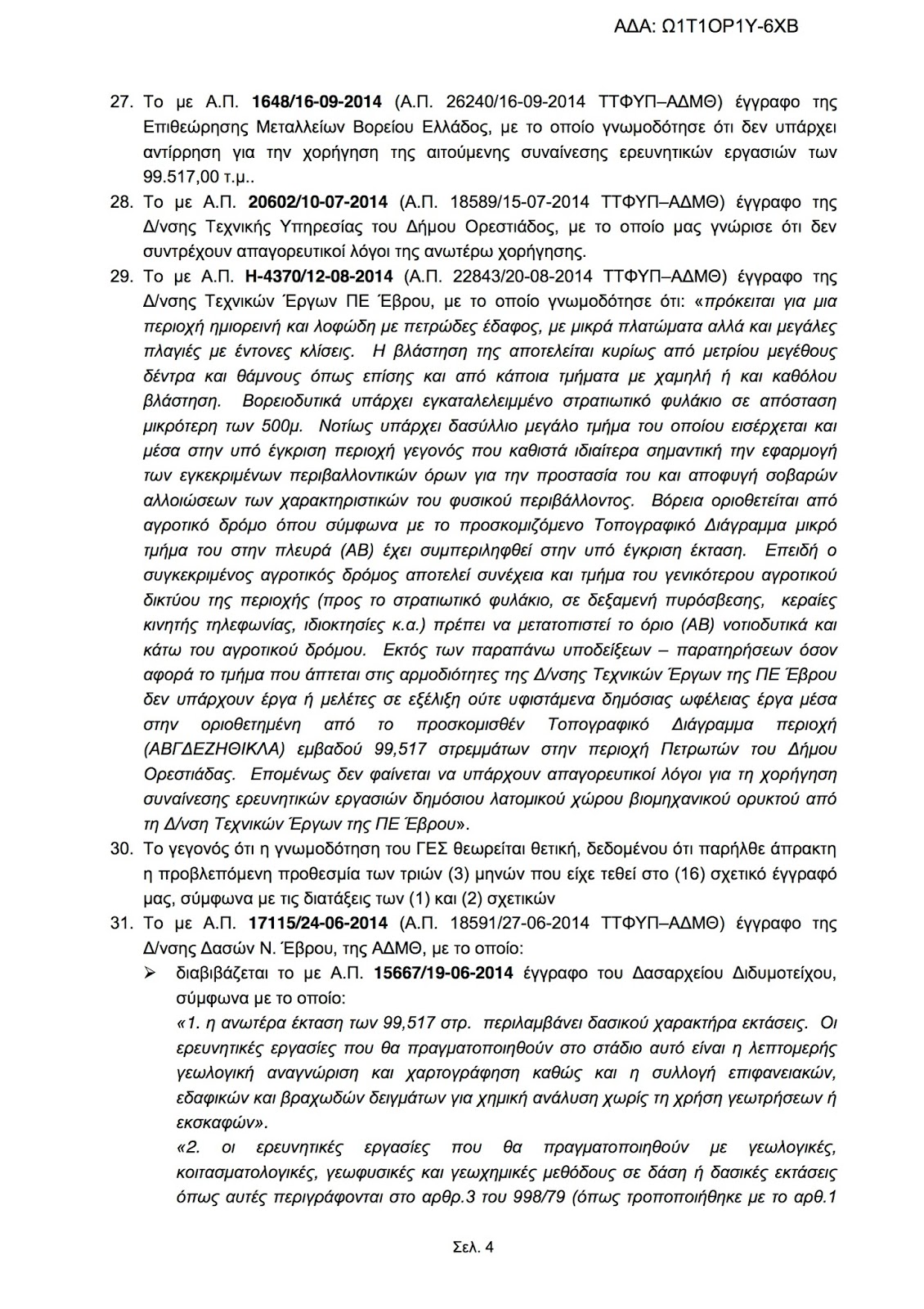 Συναίνεση για τη διενέργεια ερευνητικών εργασιών προς διαπίστωση ύπαρξης βιομηχανικού ορυκτού (ζεολίθου), σε έκταση 97.315,50 τ.μ. (αρχικής 99.517,00 τ.μ.) στην περιοχή «Μαύρη Πέτρα» της Τ.Κ. Πετρωτών, του Δ. Ορεστιάδος, Π.Ε. Έβρου της εταιρίας «ΟΛΥΜΠΟΣ ΒΙΟΜΗΧΑΝΙΚΑ ΟΡΥΚΤΑ ΑΕ» (ΑΒΛ 27.112)